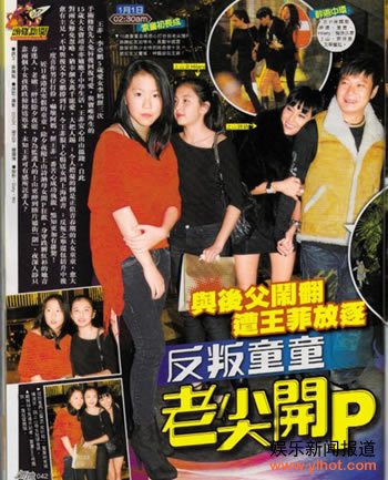 王菲与窦唯所生的15岁大女窦靖童,3岁时父母离婚,单亲成长的她从小独立。童童小时与继父李亚鹏感情不错,但进入青春期后个性逐渐反叛,近年不时与后父李亚鹏撑到行,更一度反叛作男仔打扮,与李亚鹏矛盾不断。王菲为减少父女摩擦,将童童“放逐”到上海寄宿学校。此次一家兵分三路赴港,估计今天童童生日,应该能够团圆。